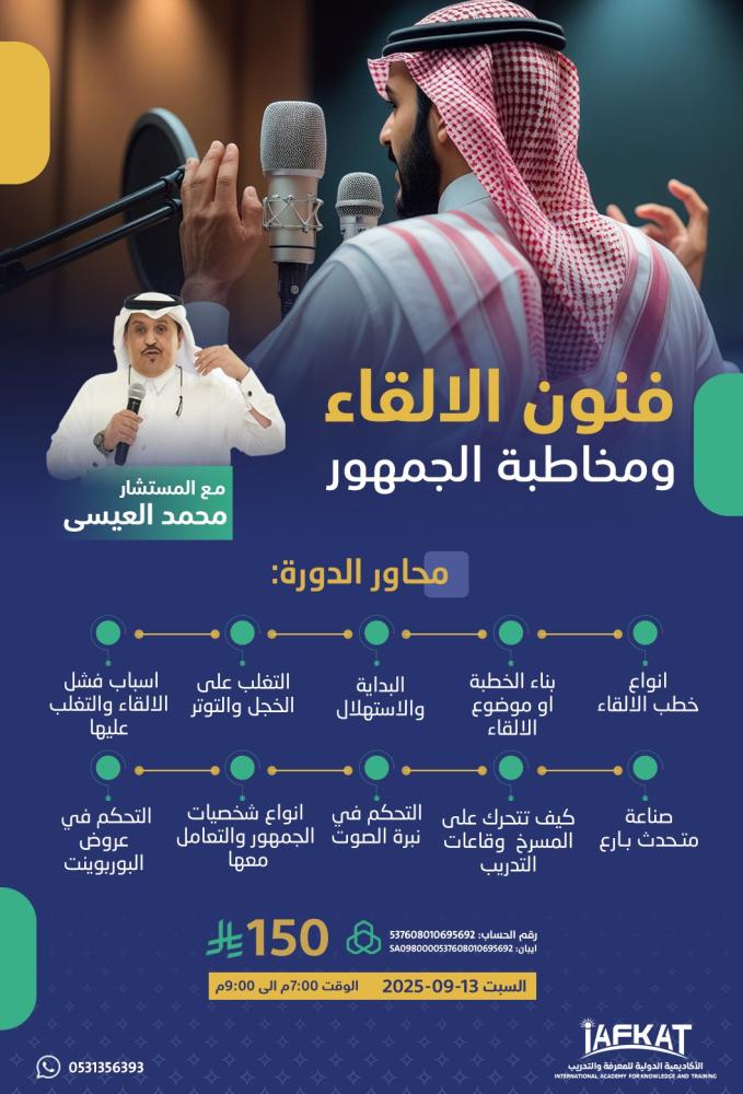 في عالم يزداد فيه التنافس على إيصال الأفكار والتأثير بالآخرين، يصبح فن الإلقاء ومهارات مخاطبة الجمهور أداة لا غنى عنها لكل قائد وموظف ومهني يسعى للتأثير والإقناع.
