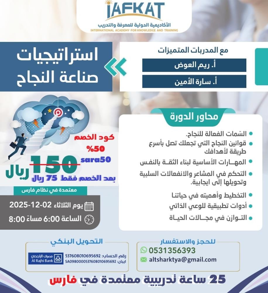 برنامج تدريبي مكثّف يقدّم خارطة عملية لصناعة النجاح في مختلف جوانب الحياة: العمل، والعلاقات الإنسانية، والتنمية الشخصية. يدمج بين أحدث نماذج التفكير الاستراتيجي وعلم النفس الإيجابي ومهارات إدارة الذات، ليُمكّن المتدرب من تصميم “إستراتيجيته الخاصة للنجاح” بدل الاكتفاء بردّات الفعل والصدف.