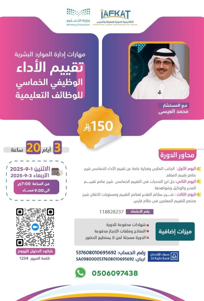 يُعد تقييم الأداء الوظيفي من الركائز الأساسية لرفع كفاءة العاملين وتحقيق الأهداف المؤسسية في المنظمات التعليمية. في هذا البرنامج التدريبي المتخصص، نسلط الضوء على نموذج التقييم الخماسي للوظائف التعليمية، والذي يُعزز العدالة والشفافية في الحكم على أداء المعلمين والمعلمات وفق معايير موضوعية ومحددة.